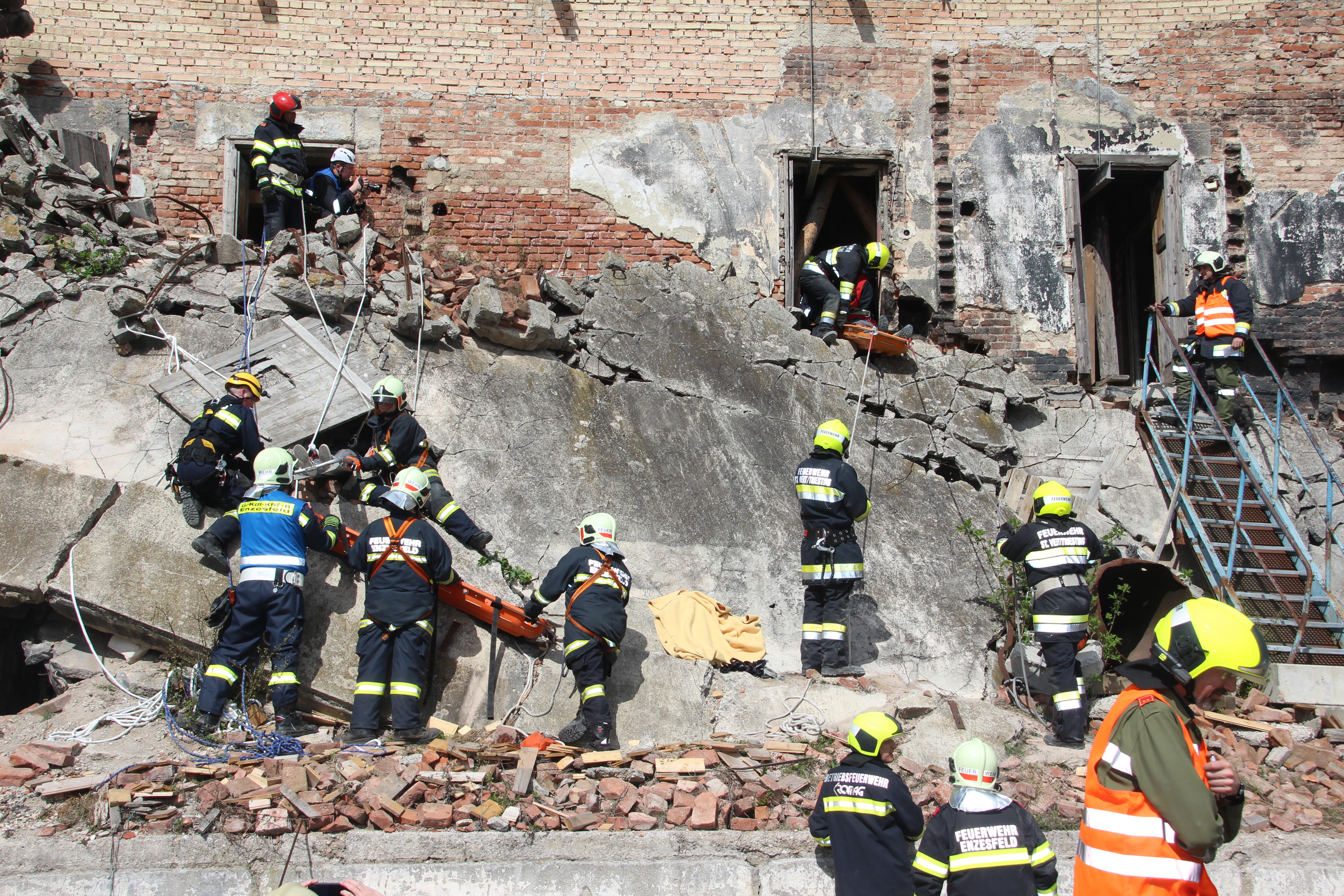 Die beiden Gruppen der FF St. Veit bekamen den Auftrag, das Obergeschoß eines teilweise eingestürzten Gebäudes nach vermissten Personen zu durchsuchen und diese zu retten. Insgesamt konnten 3 verletzte Personen geortet werden, zwei Personen waren Verletzten-Darsteller des Teams Österreich, eine verletzte Person wurde durch eine Übungspuppe dargestellt, die unter schweren Betonblöcken eingeklemmt war. Eine der beiden Personen wies schwere Gesichts- und Beinverletzungen auf, die andere war schwer verletzt von einer Zwischendecke zu retten. Während der Rettungsarbeiten mussten drei Kameraden abgezogen werden, die als Atemschutzträger zur Unterstützung bei einem Kellerbrand mit gleichzeitiger Menschenrettung eingesetzt wurden. Nach dem zwei Personen aus dem Obergeschoss gerettet wurden, war als nächste Übungseinlage die Rettung eines verunfallten Feuerwehrkameraden erforderlich, der sich bei der Erkundung eines eingestürzten Kellers, in dem sich eine zu rettende Person (Übungspuppe) befand, einen Beinbruch zuzog. Hier waren die extrem beengten Raumverhältnisse ein Erschwernis, doch konnte auch diese beiden Personen mit sehr viel Improvisationsgeschick gerettet werden.