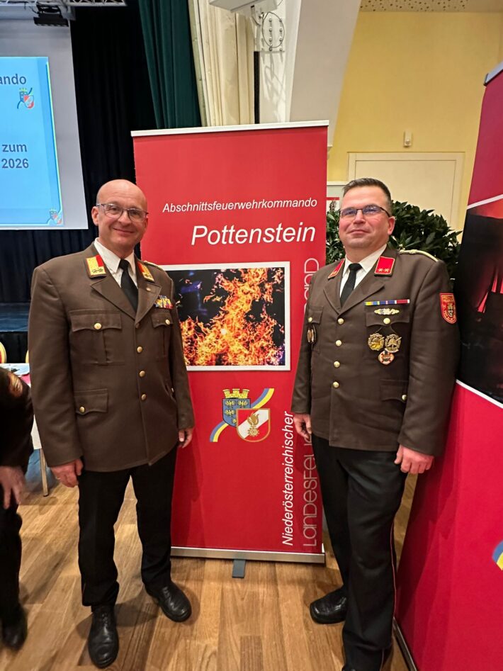 Mit großer Zustimmung wurde Brandrat Rudolf Hafellner von der Freiwillige Feuerwehr St. Veit an der Triesting erneut zum Abschnittsfeuerwehrkommandanten des Feuerwehrabschnittes Pottenstein gewählt. Diese Wiederwahl ist eine klare Bestätigung seiner engagierten und umsichtigen Arbeit in den vergangenen Jahren. Als Abschnittsfeuerwehrkommandant-Stellvertreter wurde ABI Gerald Lechner von der Freiwillige Feuerwehr Furth an der Triesting in seiner Funktion bestätigt. Zum Leiter des Verwaltungsdienstes wurde VI Stephan Schildbeck (FF Altenmarkt) bestellt, unterstützt von HV Christoph Steinacher (ebenfalls FF Altenmarkt) als Stellvertreter.