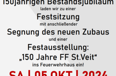 Anlässlich des 150 jährigen Bestandsjubiläum laden wir zu einer Festsitzung mit anschließender Segnung des Zubaus und einer Festausstellung: “ 150 JAHRE FF ST.VEIT / TRIESTING“ HIER WEITERLESEN