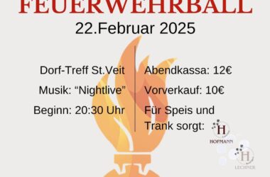 Die FF St.Veit feiert auch 2025 ! In gewohnter Weise laden wir daher Euch auch heuer zum Feuerwehrball ein! ACHTUNG ! HEUER FINDET DER BALL HIER WEITERLESEN