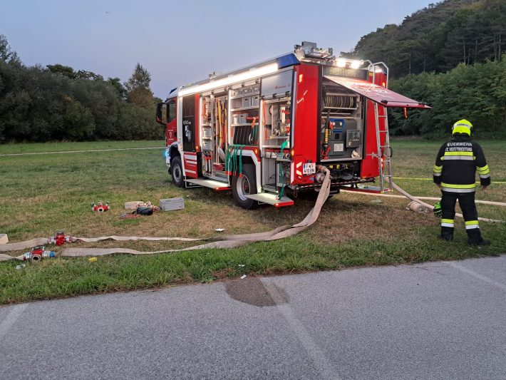 Am 29.09.2023 stand eine spannende Übung mit dem Titel „Löschwasserförderung“ am Übungsplan der FF St.Veit. Gegen 18:00 wurden wir von den Übungsleitern alarmiert. So fuhren die Fahrzeuge HLFA-3, TLFA, LFA-B und unser VF Richtung Parkplatz der Schaeffler Austria GmbH. Dort angekommen war ein spannendes Szenario vorbereitet: Eine Lagerhalle steht im Vollbrand und keine Hydranten sind in der Nähe. Unser HLFA-3 übernahm sofort die Brandbekämpfung beim Gebäude. Währenddessen brachte die Mannschaft des LFA-B unsere Tragkraftspritze bei der Wasserentnahmestelle vor der Brücke in Stellung. Auch das TLFA kümmerte sich um eine Wasserversorgung und kam zum Entschluss, dass mittels Unterwasserpumpen in der Triesting angesaugt wird und mittels der Einbaupumpe die geforderte Wassermenge zum nächsten Fahrzeug gebracht wird. Da eine Distanz von ca. 200m von beiden Zubringerleitungen überwunden werden musste, wurde fast alle B-Schläuche aus allen Autos benötigt!