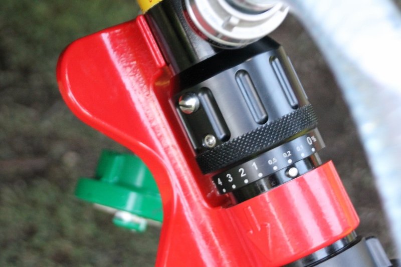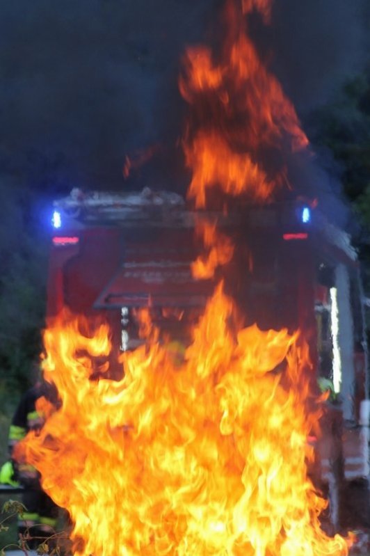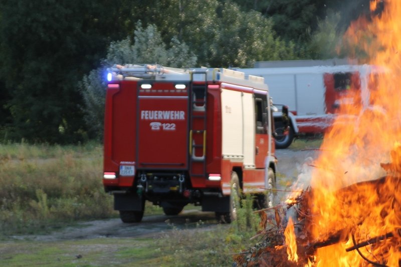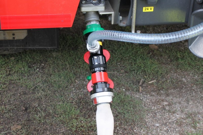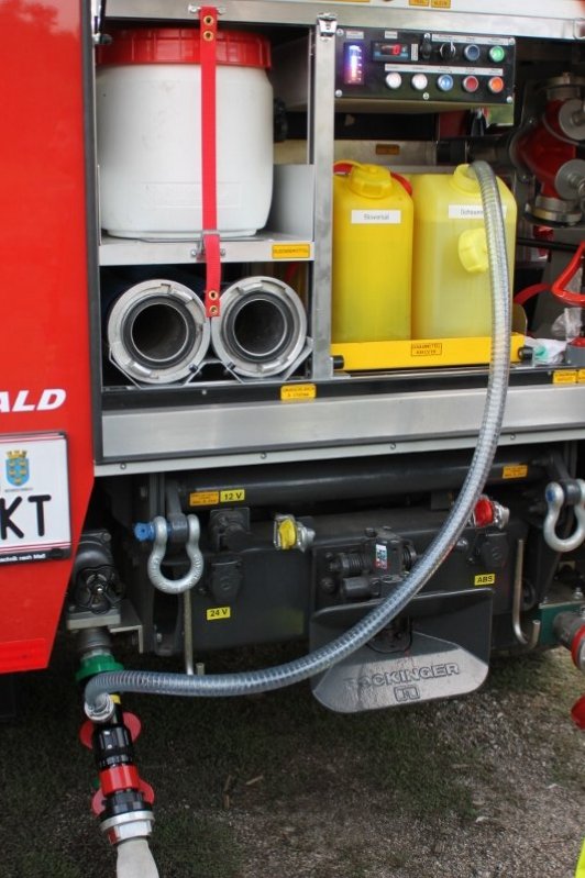 Im Vergleich dazu, um die Löschwirkung von Mittelschaum zu erkennen, wurde der nächste Angriff mit dem AWG Zumischer (Z2) direkt am C-Ausgang des LFA-B und dem dazu passenden AWG-Schaumrohr-Aufsatz durchgeführt. Wir haben unser Fahrzeug so konzipiert, dass der Zumischer direkt am C-Druckausgang im Heck angeschlossen und der Schaummittel-Saugschlauch in die im Geräteraum 5 gehalterten Kanister mit Schaummittel und Bioversal geführt werden kann. Bei einer Zumischrate von eingestellten 3% konnte ein perfekt, kompakter Mittelschaum erzeugt werden, der uns eindrucksvoll seine Löschwirkung präsentierte.