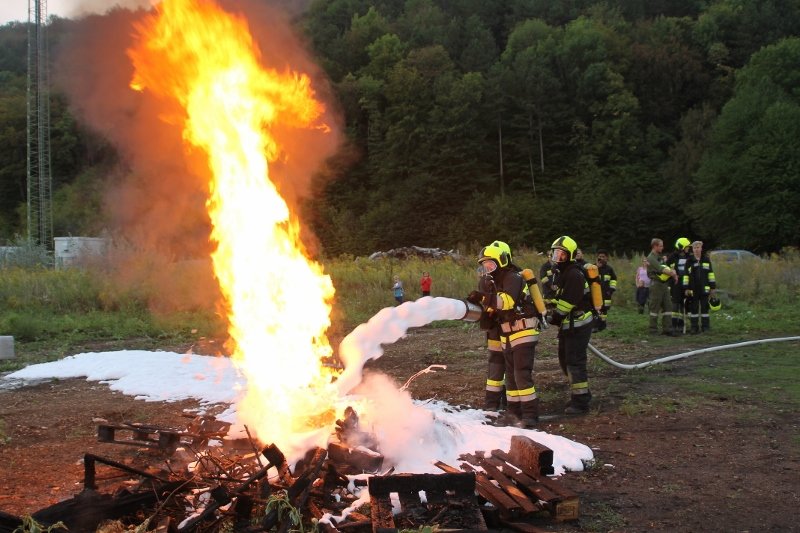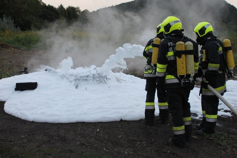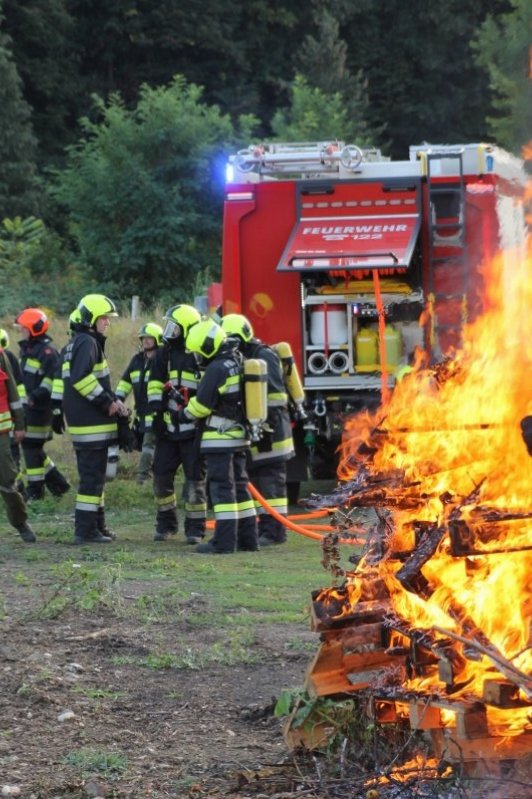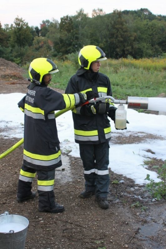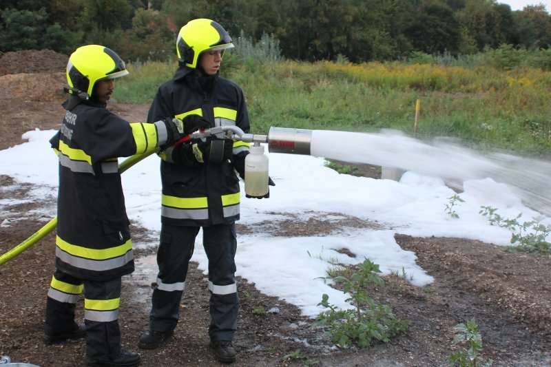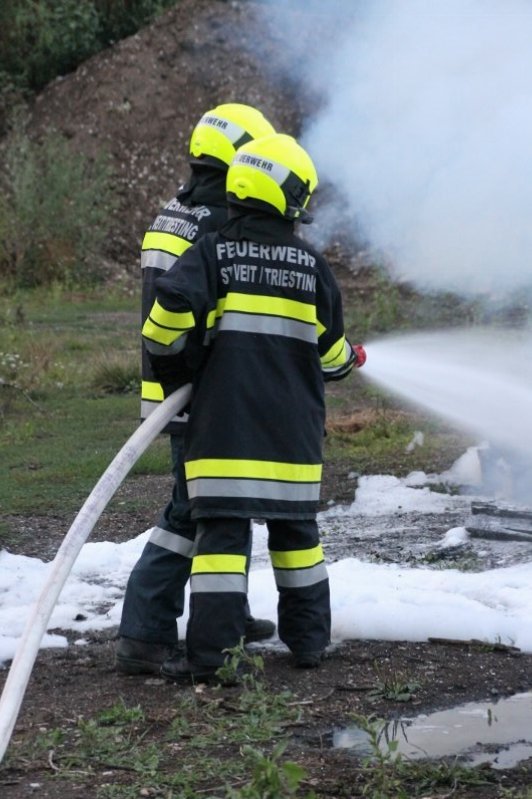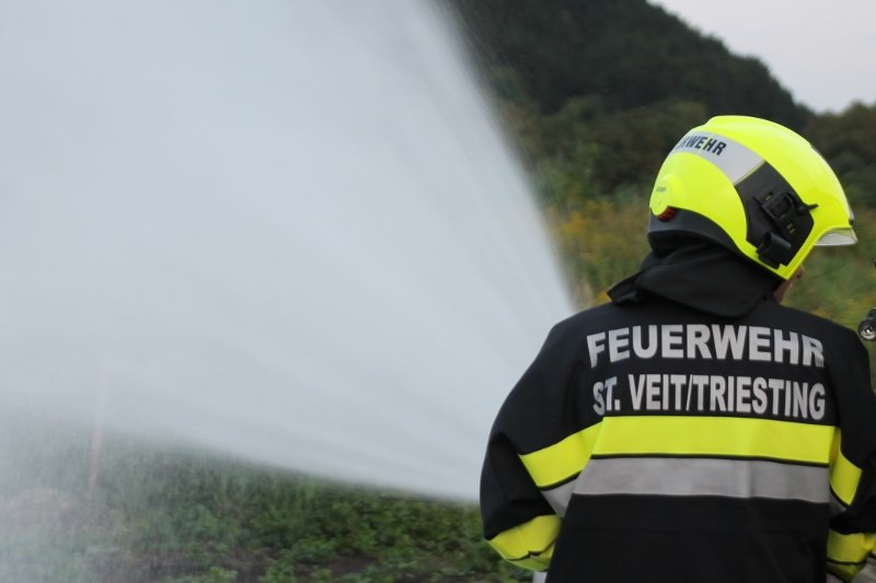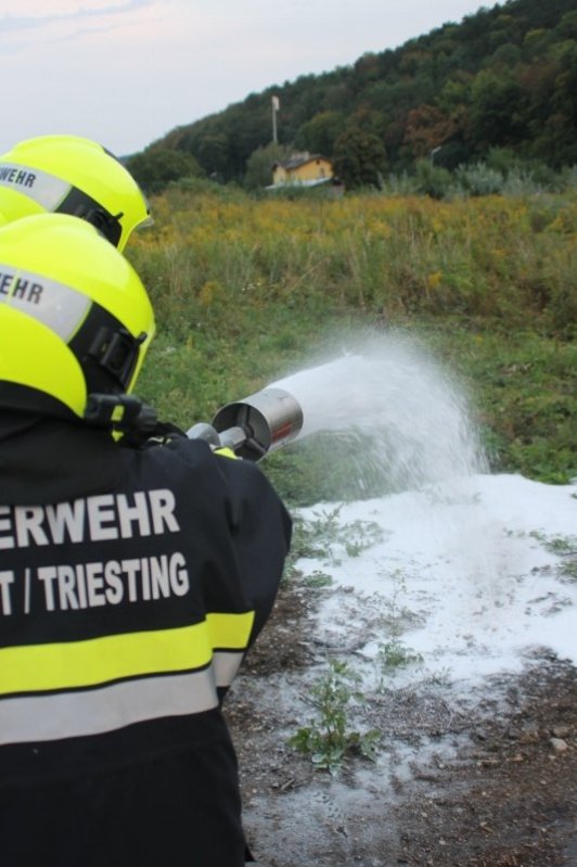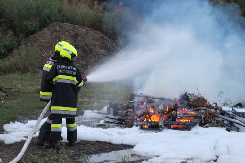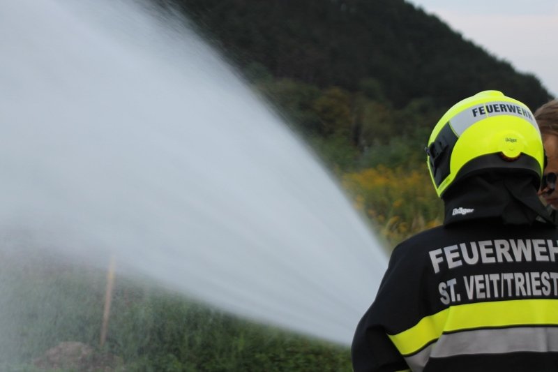 Die Kameraden der Freiwilligen Feuerwehr St. Veit an der Triesting sind am 31. August 2018 mit einer spannenden und sehr aufschlußreichen Übung, mit dem Thema „Schaum und Bioversal als Löschmittel“ in das zweite Übungs- und Ausbildungs-Halbjahr 2018 gestartet! Im Mittelpunkt dieser „Schaum-Übung“ stand vorranging unser neues Einsatzfahrzeug, das mit seinen 800 Litern „Erstschlag-Wasser“ einen entsprechend sparsamen Umgang mit dem Löschmittel erfordert. Um beispielgebend die Löschwirkung des reinen Wassers zu demonstrieren wurde einsatzmäßig ein Angriff auf einen Festbrennstoff-Brand mit einem C-Hohlstrahlrohr möglichst mit kurzen Stößen und Sprühstrahl vorgetragen.