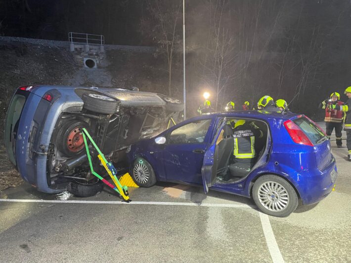 Nach der Alarmierung durch die Übungsausarbeiter rückten die Einsatzkräfte der FF St.Veit unverzüglich zum Übungsort aus. Beim Eintreffen bot sich folgendes Bild: Zwei PKW, einer davon auf der Seite liegend, mit jeweils mehreren eingeklemmten Personen. Die erste Aufgabe bestand darin, die Einsatzstelle abzusichern und einen Brandschutz aufzubauen. Parallel dazu wurden die Fahrzeuge gegen Wegrollen und weitere Bewegungen mittels Stab-Fast gesichert.