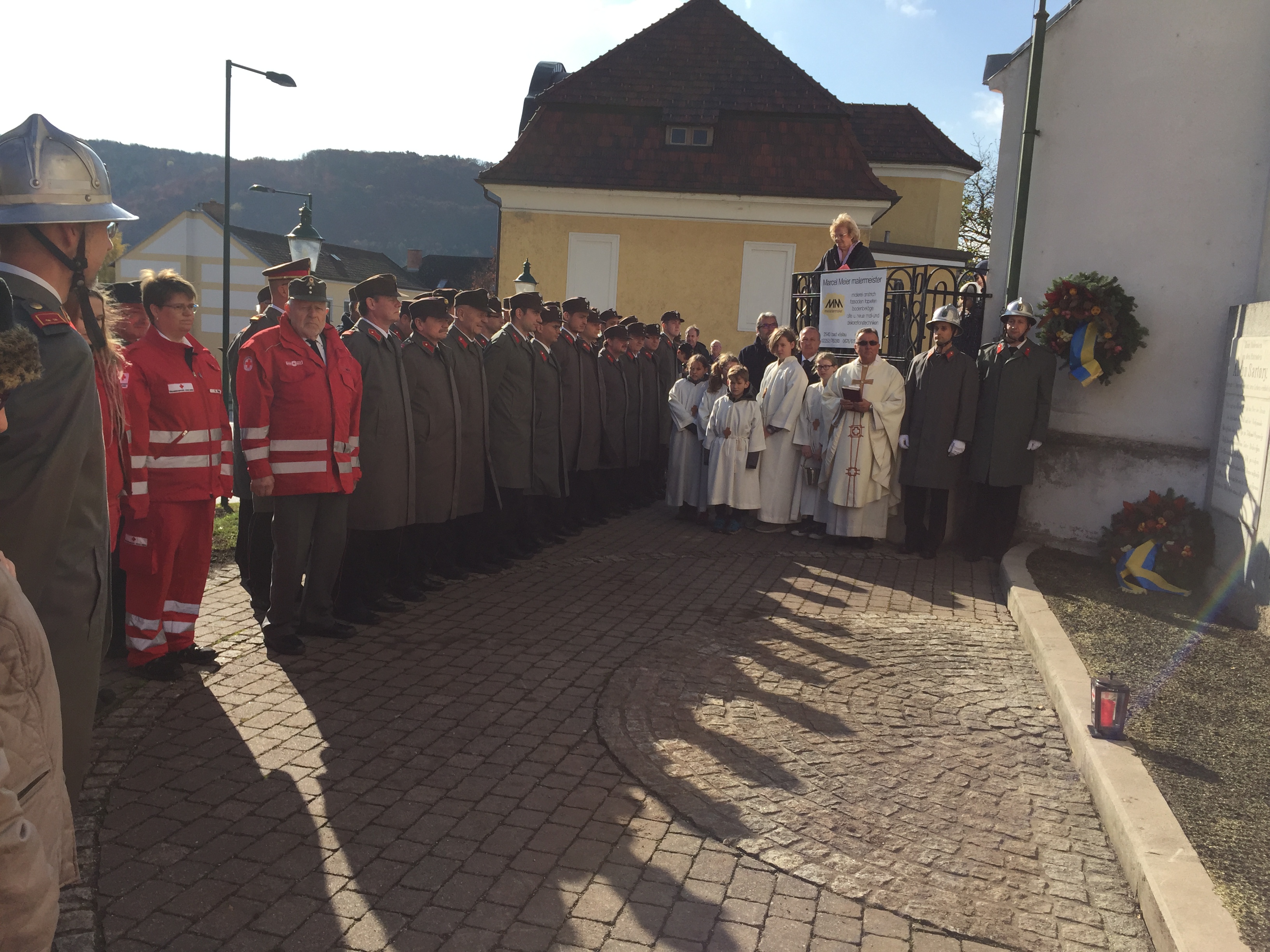 Nach der Heiligen Messe, zelebriert von Feuerwehrkurat Pfarrer Dr. Tomo Cubela, begaben sich die Abordnungen und die Messbesucher zum Kriegerdenkmal an der Ostseite der Pfarrkirche. Nach einem Gebet und der Kranzniederlegung ertönte das Lied vom „Guten Kameraden“, dargebracht von einem Quartett des Musikvereins St. Veit.